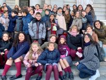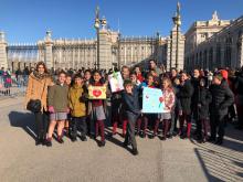 Los alumnos de 4º de primaria, que están preparándose para hacer la Primera Comunión, junto con los Grupos de la Merced de Primaria y Secundaria, han participado en la ofrenda floral solidaria a la Virgen de la Almudena con motivo de su fiesta.